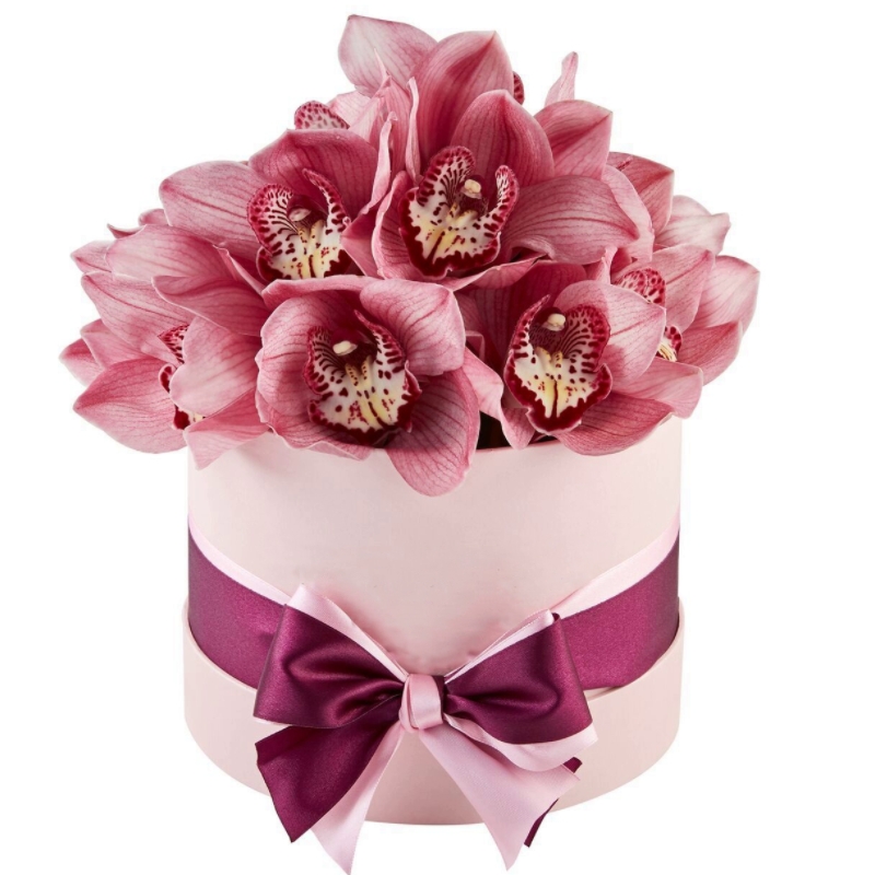 Букет состоит из 15 орхидей, коробка, оазис, атласная лента.