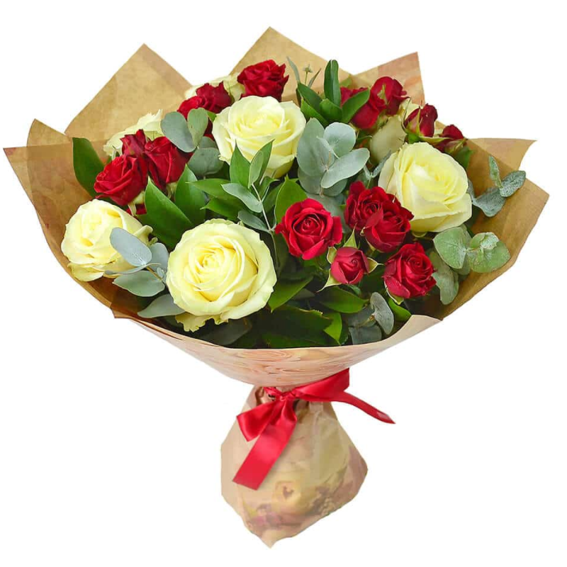 Букет состоит из 7 белых роз, 4 ветки красных кустовых роз, эвкалипт, крафт, атласная лента.