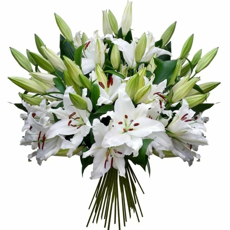 Букет состоит из 15 белых лилий, прозрачная упаковка, атласная лента.