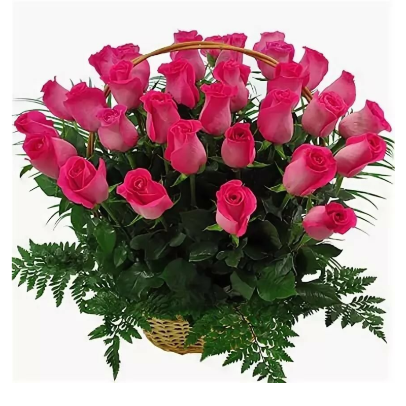 35 малиновых роз, папоротник, корзина.